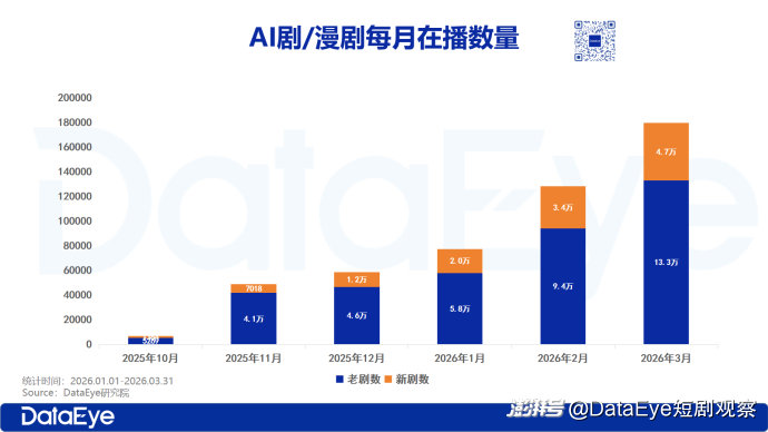 截至Q1,抖音端原生在播AI剧/漫剧约18万部。其中,3月单月新增AI剧/漫剧约5万部。