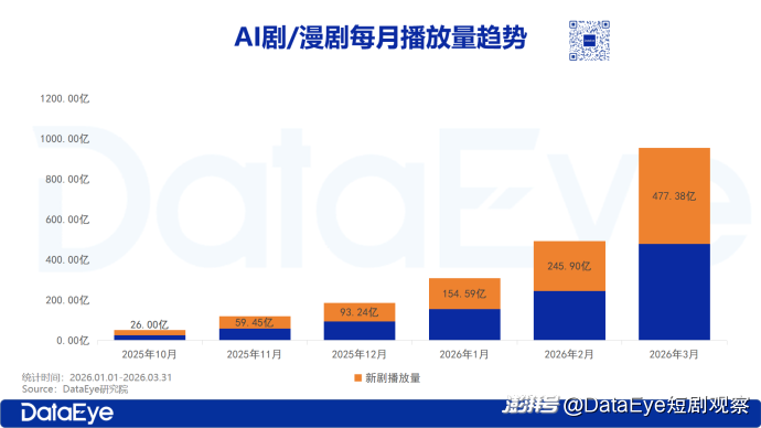 2026年Q1总播放量近1300亿播放,2026年3月份环比2月份播放量增长78.9%,完全印证了AI漫剧赛道的用户渗透与爆发力。例如,2026年3月的新剧播放量477.38亿,占总播放量64.3%,成为绝对播放量主力。