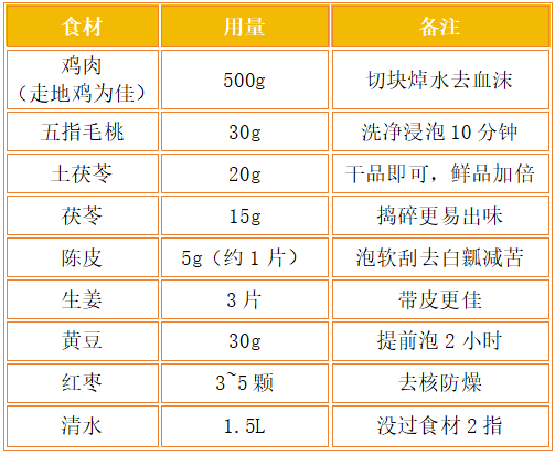 鸡肉优先选择走地鸡500g,切块焯水去血沫;五指毛桃30g,洗净浸泡10分钟;土茯苓20g,干品即可,鲜品用量加倍;茯苓15g;陈皮5g(约1片),浸泡软后刮去白瓤减苦;生姜3片,带皮更佳;黄豆30g,提前浸泡2小时;红枣3-5颗,去核防燥;加入1.5L清水,没过食材2指即可。
