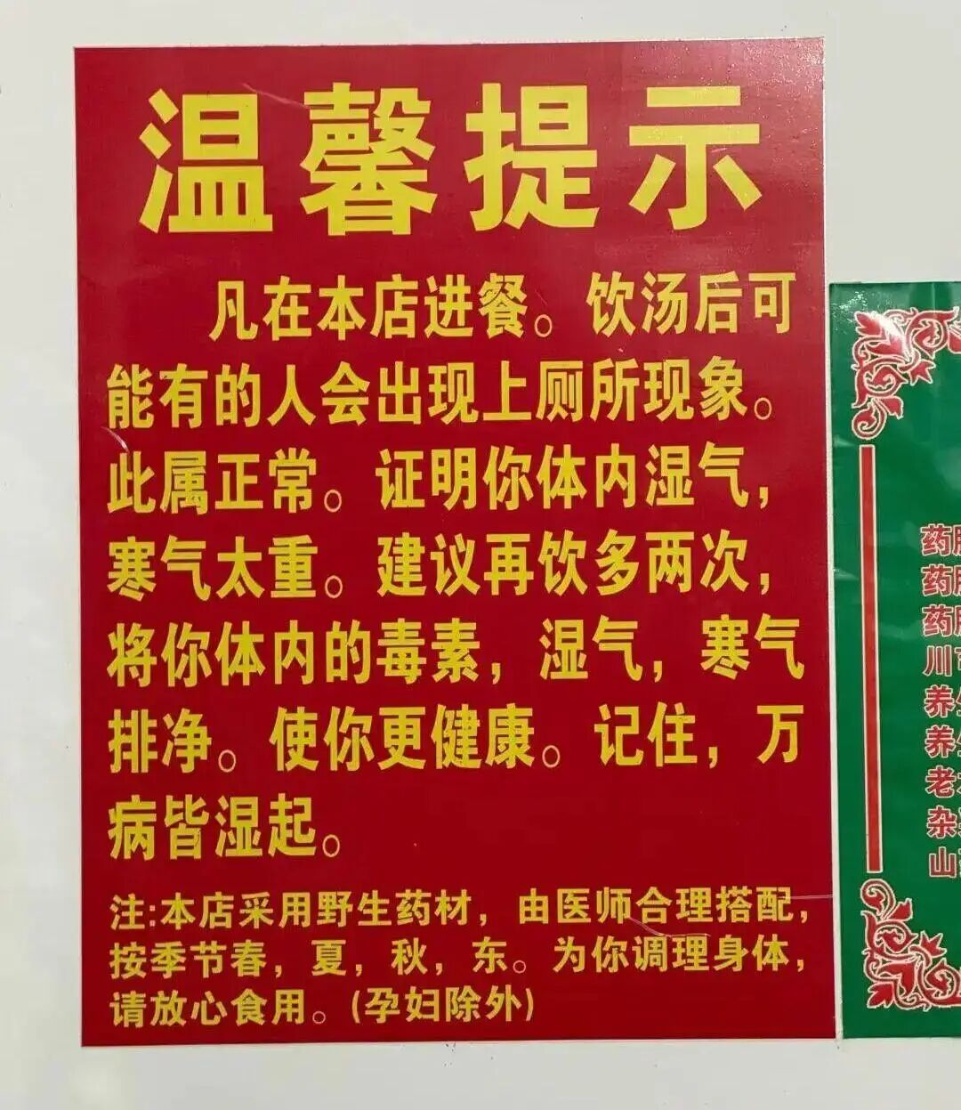 值得注意的是,莫氏鸡煲店内张贴着一则实在提示:“喝汤可能拉肚子”,这让不少食客产生疑惑。对此,王明主任指出,这并非食材不卫生,而是与个体体质差异及配方特性密切相关,主要分为三种情况: