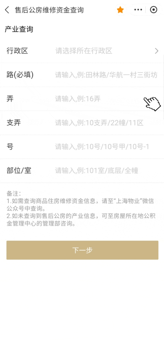 1、进入“随申办”查询页面,填写地址信息,点击“下一步”,选择对应的地址信息。