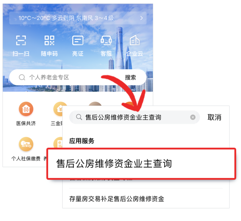 在“随申办”(APP、微信小程序或支付宝小程序)的搜索框中输入“售后公房维修资金业主查询”,点击对应的“应用服务”进入查询页面。