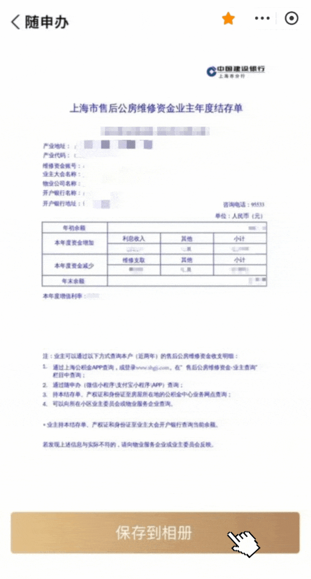 2、如需纸质结存单,可通过以下方式获取:业主凭身份证、18位产业代码或12位产业账号(未开通),前往就近建设银行网点打印纸质结存单。