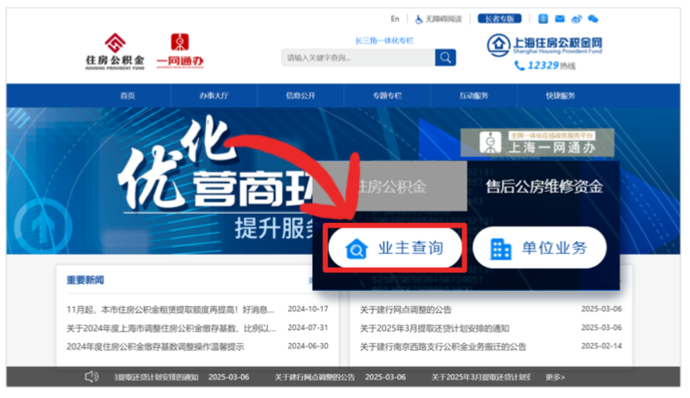 打开上海住房公积金网,选择“售后公房维修资金”中的“业主查询”进入查询页面。