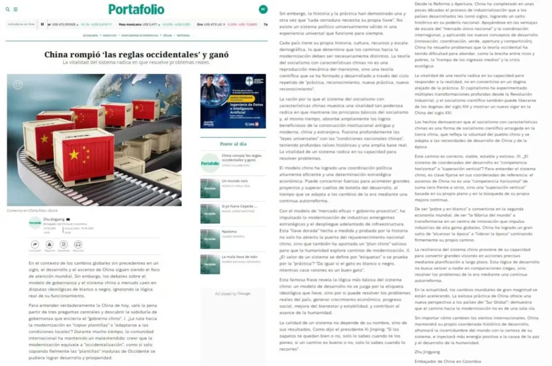 2026年4月15日,驻哥伦比亚大使朱京阳在哥主流财经媒体《证券报》发表署名文章《破除“主义”的迷雾:关于中国制度逻辑的时代三问》,结合当前部分国家意识形态和制度之争,深入解读“中国之治”破解时代难题、实现现代化发展的道路和制度优势。全文如下: