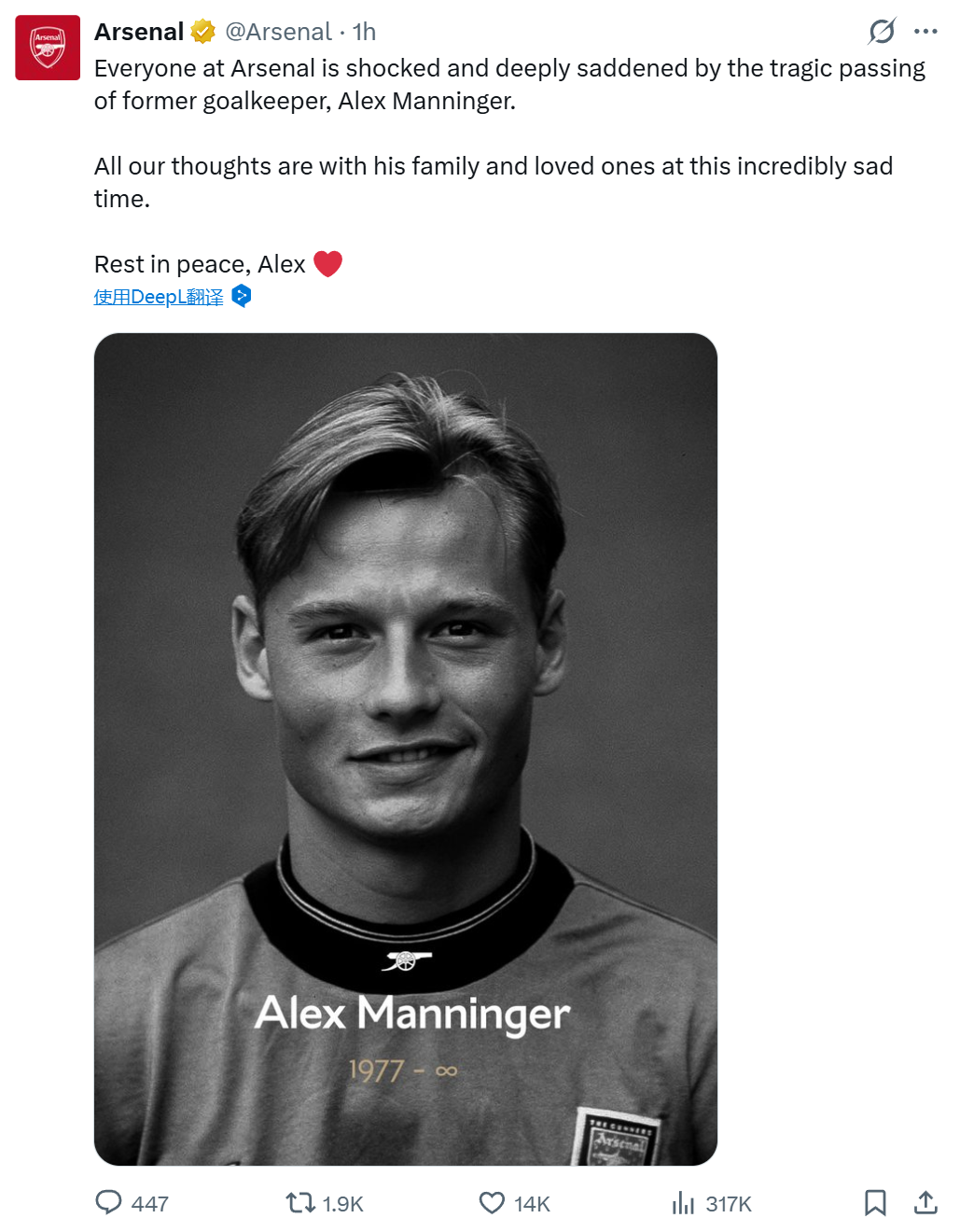 阿森纳、尤文图斯等俱乐部官方社交媒体也相继发文,深切悼念昔日门将亚历山大·曼宁格的离世。