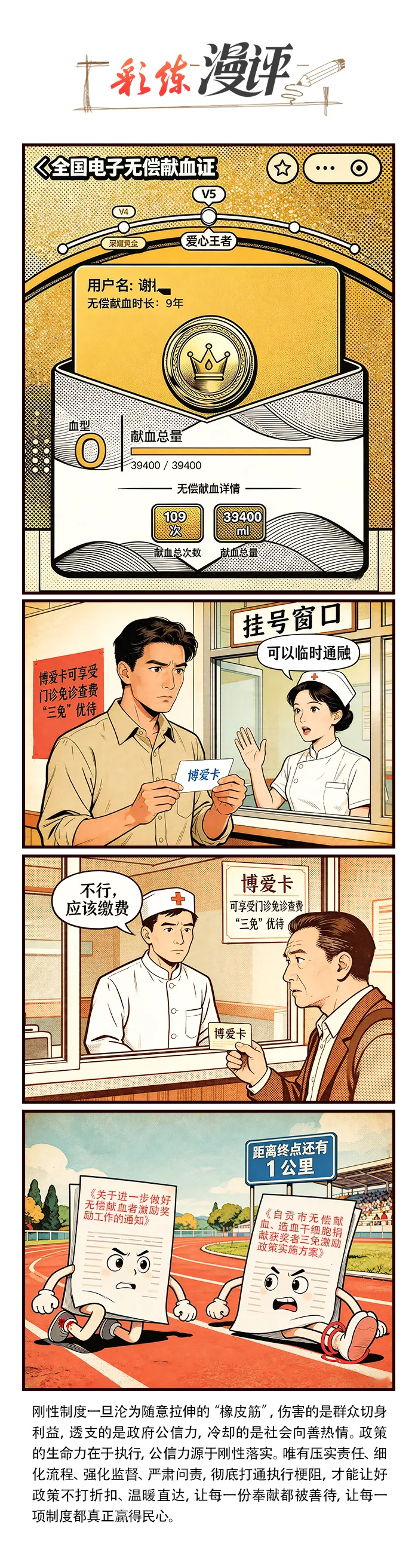 四川自贡市民谢先生十年无偿献血109次、累计近4万毫升,用持续奉献诠释人间善意。按规定申领“博爱卡”后,他可享受门诊免诊查费的“三免”优待。然而,谢先生日前在自贡市荣县人民医院使用该权益时却遇阻,首次沟通后院方临时同意,第二次遭明确拒绝。虽经媒体介入事情得以解决,但人们心中仍然有疑问:本应该是合法合规、理所应当的政策福利,为何会被无故拒绝?为何第一次可以临时通融,第二次却坚决不行?难道政策在执行中,竟然可以像橡皮筋一样随意拉伸?