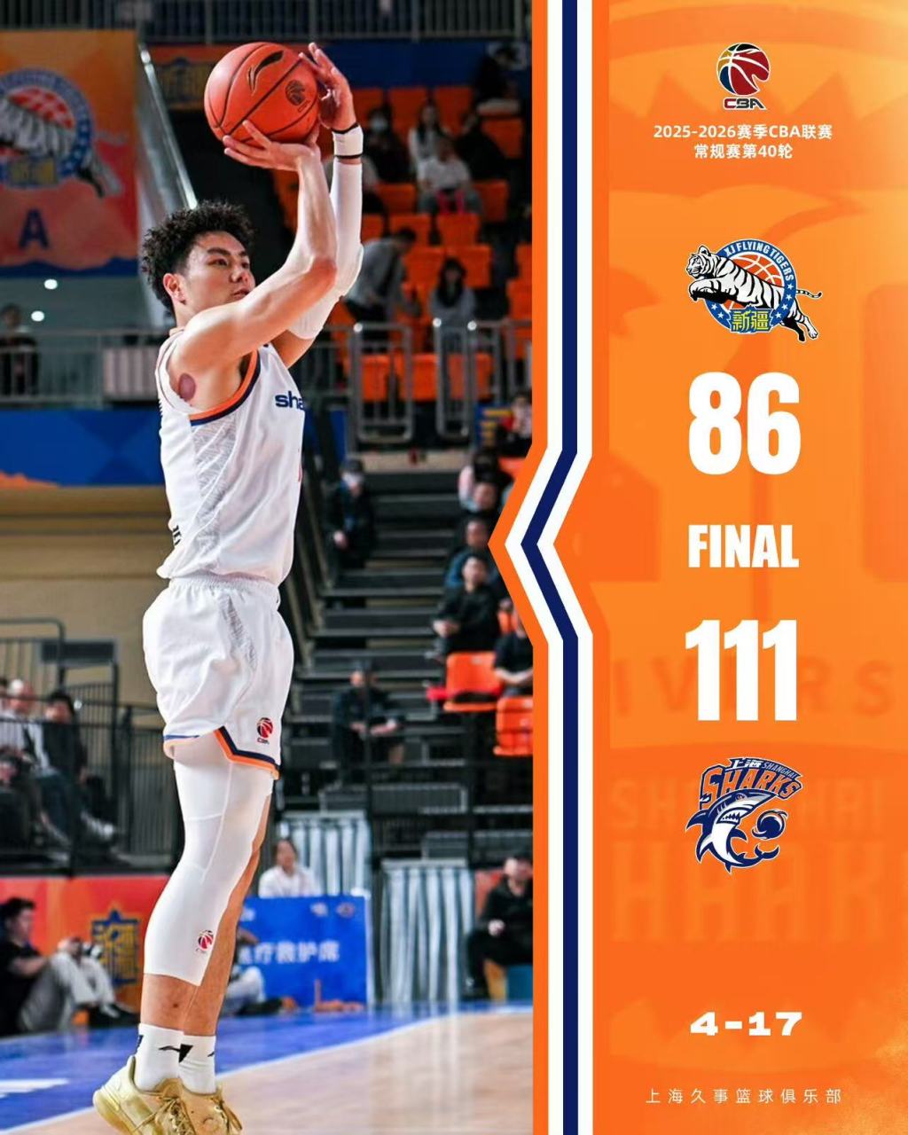 北京时间4月17日晚间,CBA联赛第40轮,已经取得20连胜的上海男篮做客挑战新疆队,最终上海男篮凭借实力上的优势以111比86赢下比赛,将连胜场次扩大到了21场。