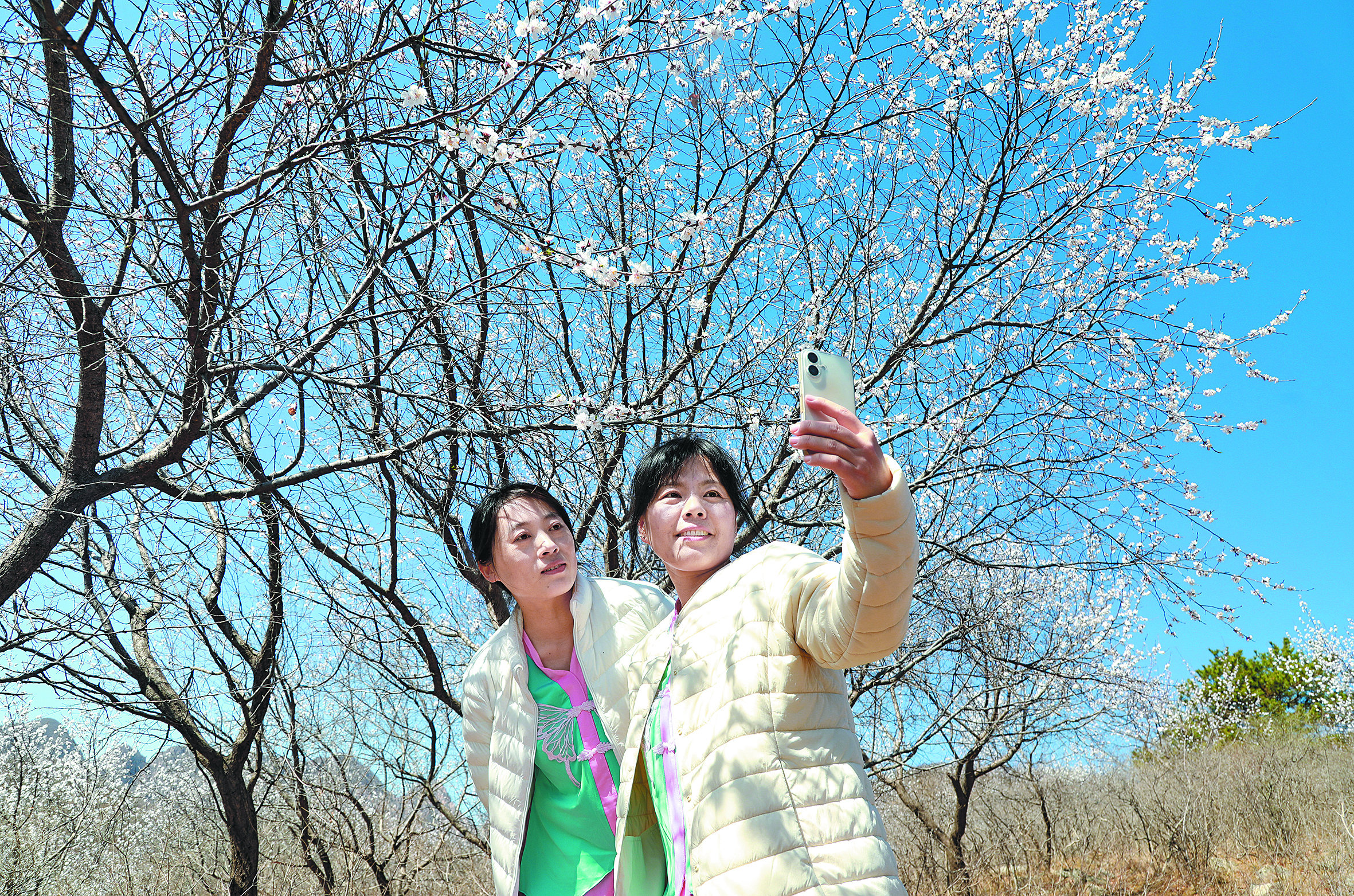 海港区驻操营镇龚庄村杏花绽放,吸引众多游客打卡拍照。
