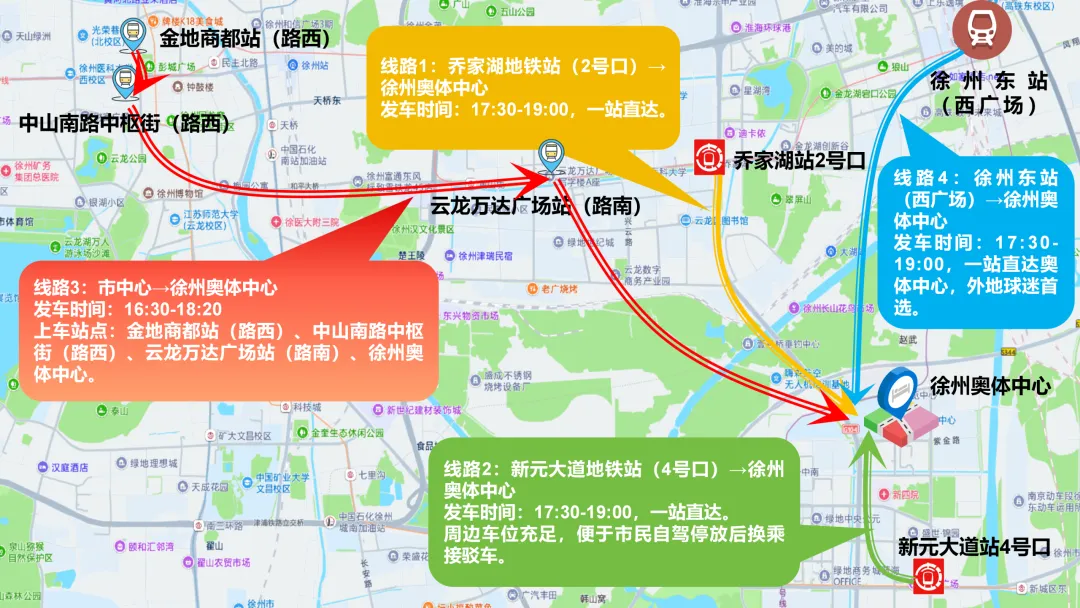 发车时间:16:30-18:20 ,上车站点:金地商都站(路西)、中山南路中枢街站(路西)、云龙万达广场站(路南)、徐州奥体中心。串联市中心核心商圈,逛街、吃饭、观赛一站式搞定,解锁观赛新体验!
