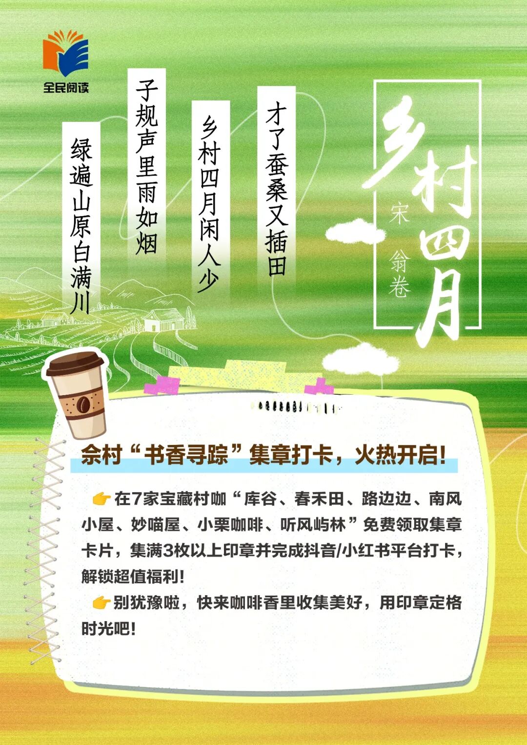 2.书咖寻宝:在佘村村咖、公共区域设置“书香”打卡点位,集齐3处打卡印章及1条打卡视频(发布至抖音、小红书),即可前往指定地点兑换咖啡抵用券(4月20日活动当天可在摊位集市兑换,后续将在指定咖啡店进行兑换)