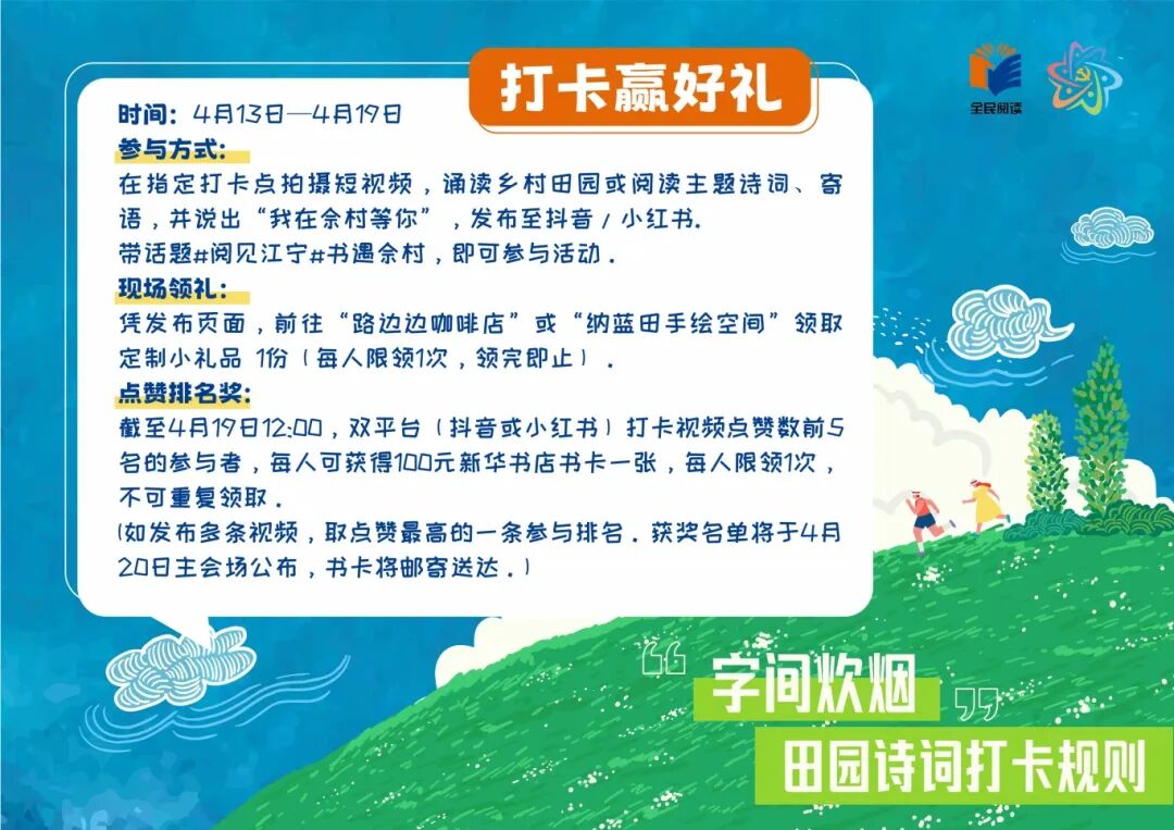 打卡内容:佘村设有3处诗词主题打卡点,在指定打卡点拍摄短视频,诵读乡村田园或阅读主题诗词、寄语,并说出“我在佘村等你”,发布至抖音/小红书,带话题#阅见江宁#书遇佘村,即可参与活动。