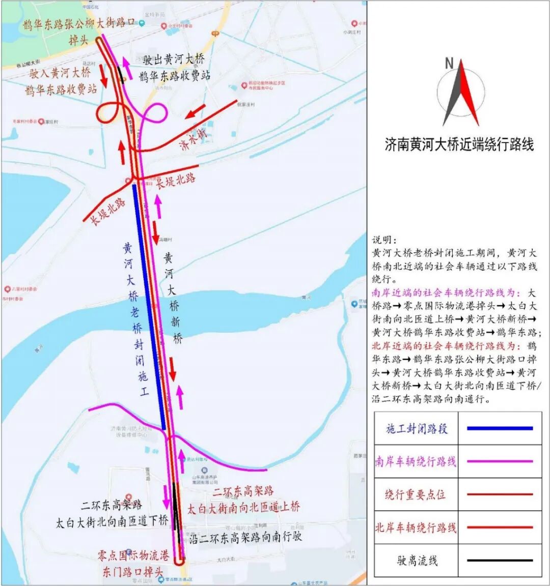 施工期间黄河大桥(老桥)禁止社会车辆通行,建议社会车辆绕行至黄河大桥(新桥)和济泺路黄河隧道通行,具体绕行路线如下: