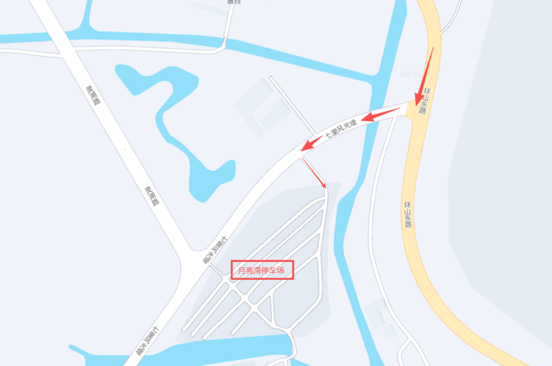 停车场预计可容纳小车约800辆,建议使用百度地图导航至月亮湾度假中心,根据现场指示牌及工作人员引导进入。具体位置见下方图示,可通过十里明珠堤经环山东路至七里风光堤(环山东路交界处)左转进入,或从雪云路/梅梁路,经古竹路,至环山东路(七里风光堤交界处)右转进入。