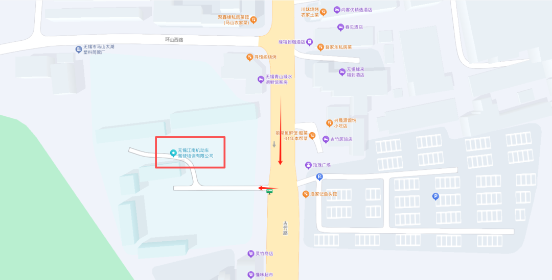 停车场预计可容纳小车约150辆,建议使用百度地图导航至无锡江南机动车驾驶培训有限公司,根据现场指示牌及工作人员引导进入。具体位置见下方图示,可从古竹路东门进入,停车后沿古竹路步行约1.5公里到达赛事预检口(群灵路)。