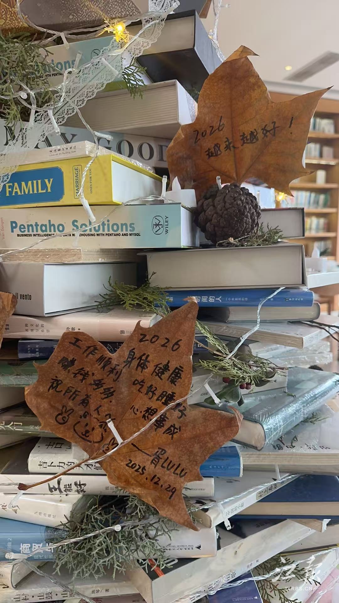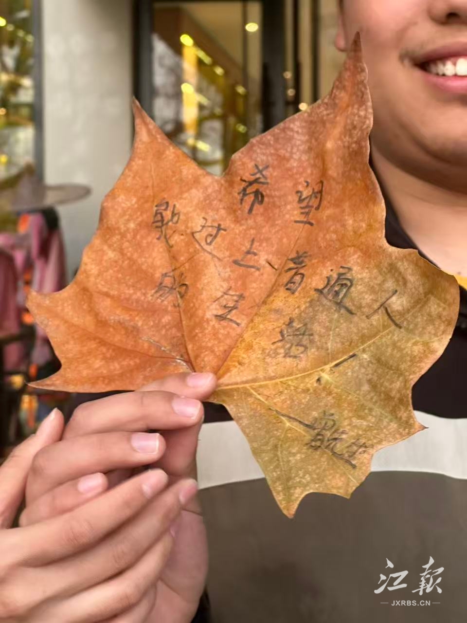 这是一个充满了物语与书香的图书馆。曾文滨还记得秋叶飘落的季节,美书馆二楼露台铺满了梧桐叶,工作人员牵着他,轻声告诉他季节的更替,那一刻,他真的是很喜欢很喜欢。他让工作人员帮他在梧桐叶上写下了一句话:“希望能过上普通人的生活!”他还拿着这片写下他心愿的梧桐叶,让工作人员为他轻轻按下快门,定格下这一刻。