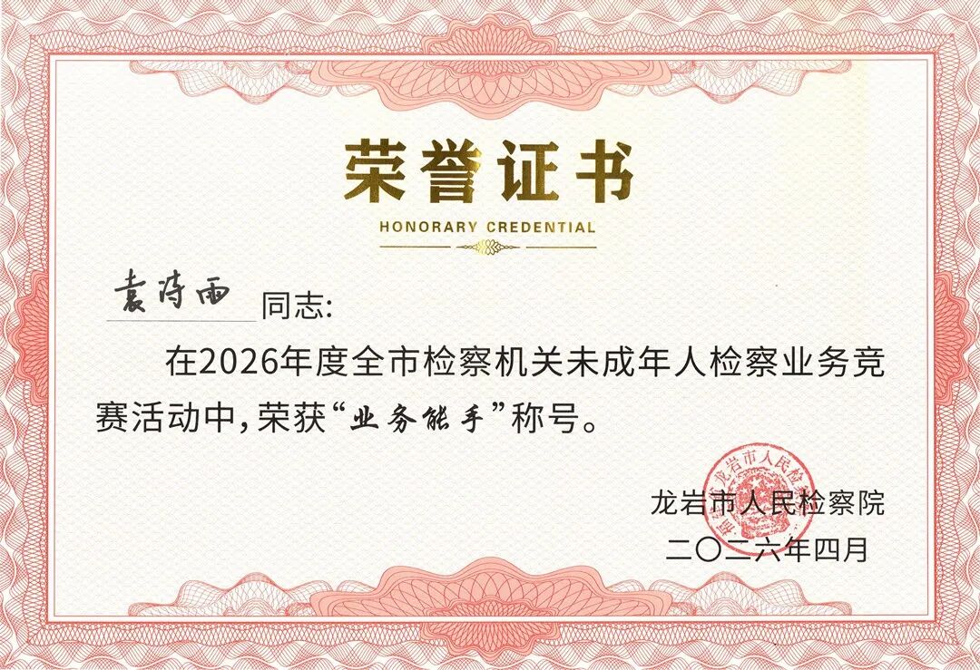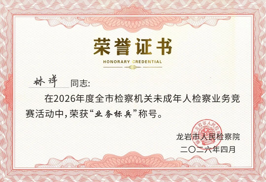 近日,在2026年度全市检察机关未成年人检察业务竞赛活动中,我院林洋同志获评“业务标兵”称号、袁诗雨同志获评“业务能手”称号。