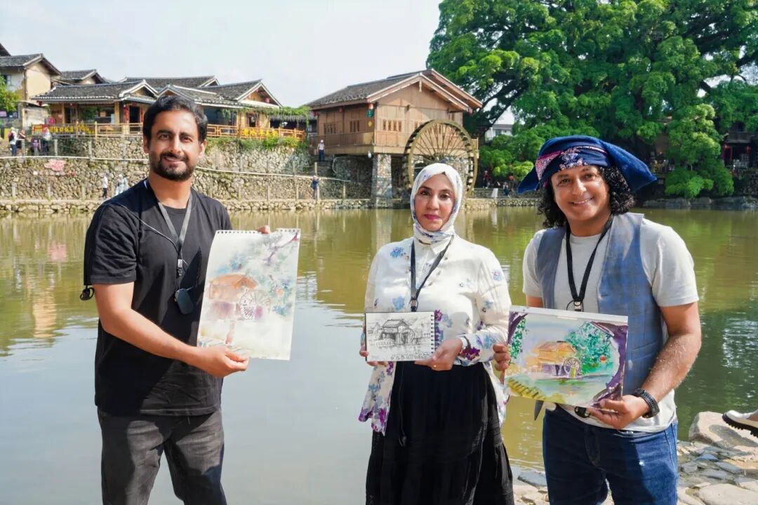 上午,来自阿曼、摩洛哥、埃及、阿尔及利亚、突尼斯、约旦等6个阿拉伯国家的9位知名艺术家在南靖云水谣与土楼展开艺术采风创作。艺术家们漫步于联合国世界旅游组织“最佳旅游乡村”官洋村,沉醉于云水谣田园牧歌、自在惬意的“闽式生活”,感受土楼“天人合一、向心而居”的“闽人智慧”。中外艺术家兴致浓厚,现场展开写生创作,以油画、水彩等艺术形式,从一砖一瓦、一溪一桥间所承载的厚重“闽南文化”中汲取源源不断的创作灵感。