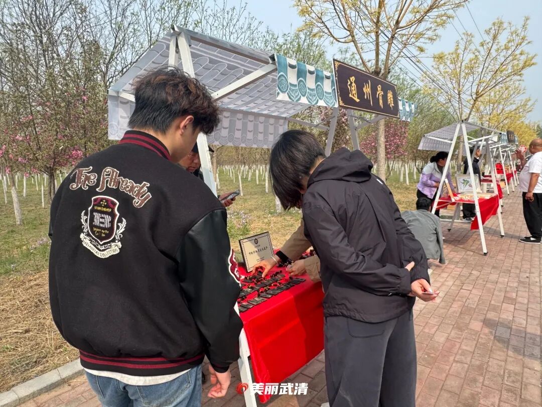 舞台之外,“非遗”展卖区和特色农品区同样人气火爆。杨村糕干、通州骨雕、武清本地的瓜果蔬菜……20多个摊位前围满了人。“非遗”传承人现场展示手艺,游客不仅能看、能买,还能上手体验。