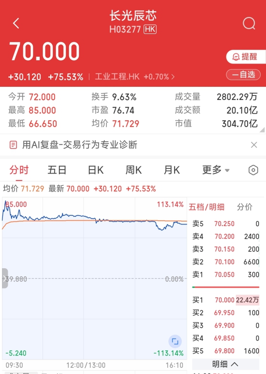 公司上市首个交易日受到市场热捧,收市报70.00港元,较发行价39.88港元上涨75.53%。全日总成交量约2802万股,总成交金额约20.10亿港元。