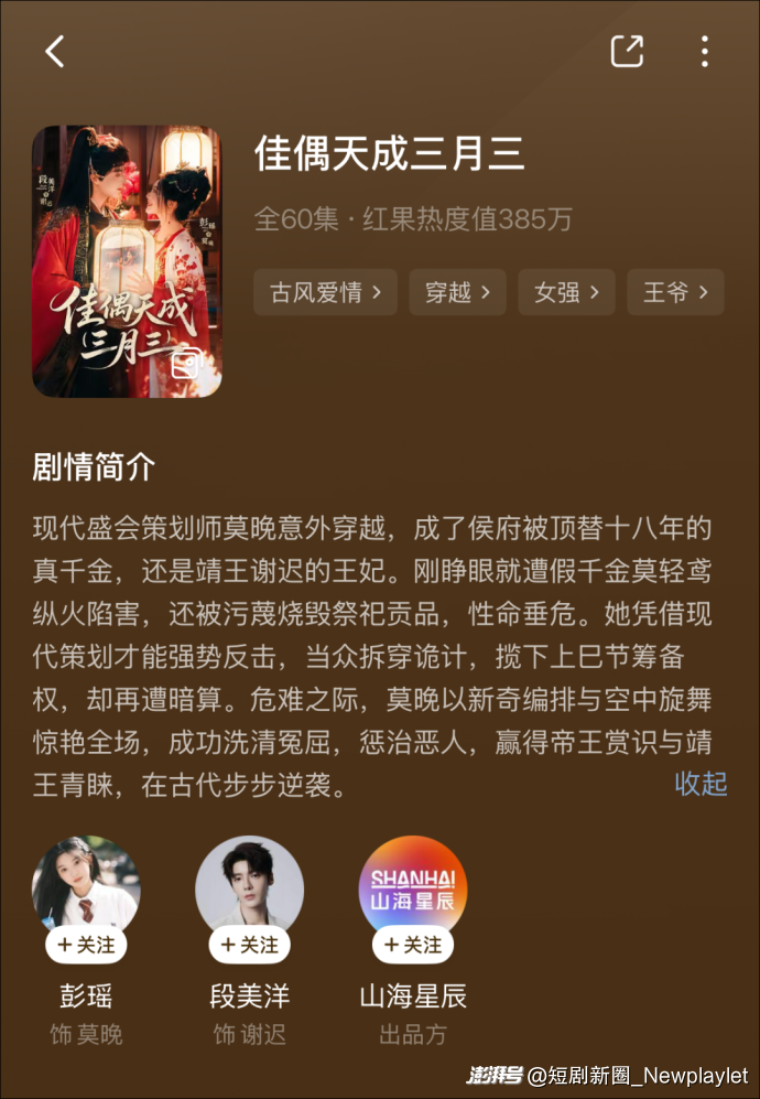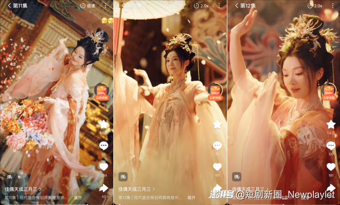 在《佳偶天成(三月三)》里,不论是角色设定、服化道表现、剧情节奏等,均能看到山海短剧优秀的制作功底。往一个优秀的女频作品中,加入非遗元素,这背后不仅是山海短剧为文化传承所作出的努力,也是在短剧内容上进行文化价值创新表达的重要尝试。