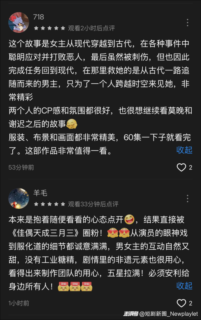 《佳偶天成(三月三)》在内容上的创新尝试,也证明了以非遗为代表的传统文化并不过时,只要用年轻人的语境进行表达,就能让非遗重新回到年轻人的视野,并受到大家的喜欢。就这一点来看,这部短剧为非遗的活态传承提供了可复制的内容样本,实现了让传统文化 “青春归来” 的目标。