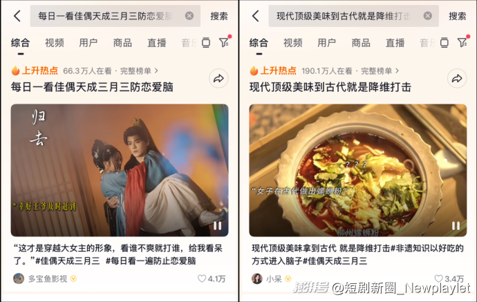 随着《佳偶天成(三月三)》开播,更多的精彩片段流出。精致的演员妆造、贴近民俗的场景设计,以及部分趣味剧情走向,很快让相关话题冲上热榜,#每日一看佳偶天成三月三防恋爱脑、#现代顶级美味到古代就是降维打击 。