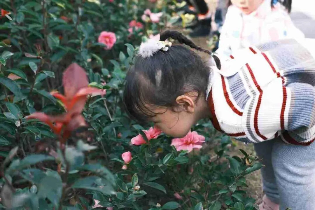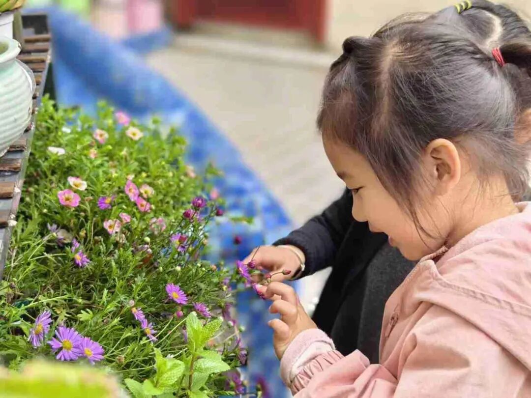 稚嫩的身影在花旁嬉闹