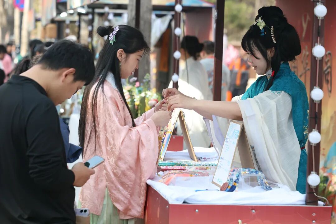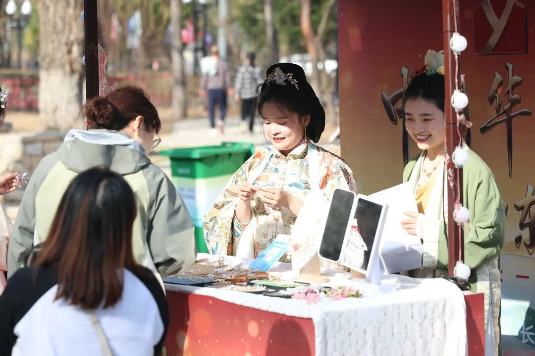 在长春市新民大街举行的国风市集,立足弘扬传统文化,沿街路两侧设置华服妆造、非遗互动、国风文创展销等区域,吸引了大量青少年驻足观看。他们在市集上通过体验参与对诗、剪纸、微刻等互动,沉浸式体验传统文化魅力,古老技艺在青春表达中焕发时代生机。