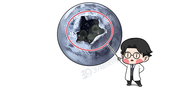 有网友发现自己买回来的蓝莓,凹陷处有菌团状异物,一掰开全是霉菌,吓得赶紧扔了。