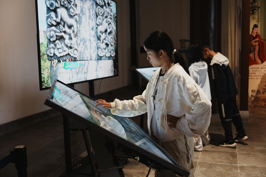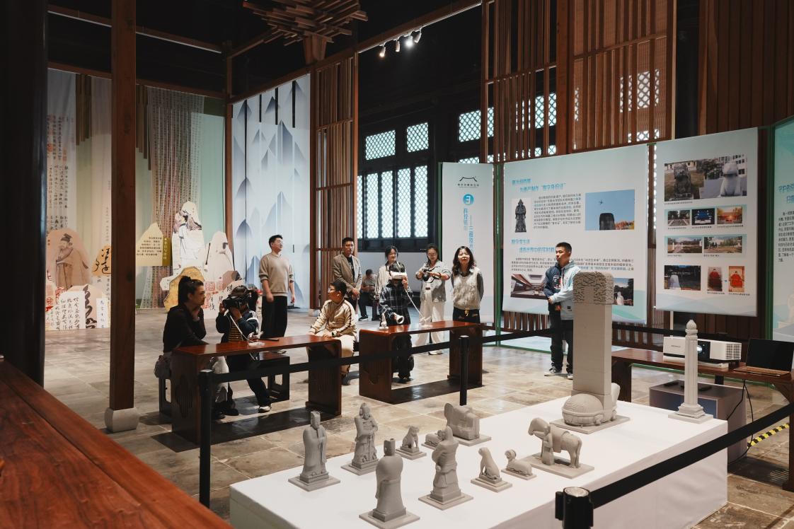 此次体验以“看见”为起点。在大成殿内,东南大学艺术学院博士研究生、东南大学成贤学院建筑与艺术设计学院教师郭城向观众进行演示:触控屏上,文物的每一处细节均可360°自由查看;戴上VR设备,观众便能身临其境地步入墓园,那些因岁月而模糊的细节纹饰,皆在眼前一一重现。“借助三维扫描与建模技术,即便是最细微的痕迹也能被永久记录下来。”郭城介绍道。