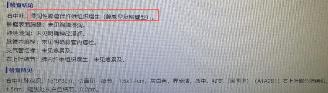 术后病理报告出来了:浸润性腺癌,腺管型和贴壁型为主,没有高危亚型(如微乳头、实体型)。当时也顺便切了右上叶的一个小结节,病理是良性的,不用管。