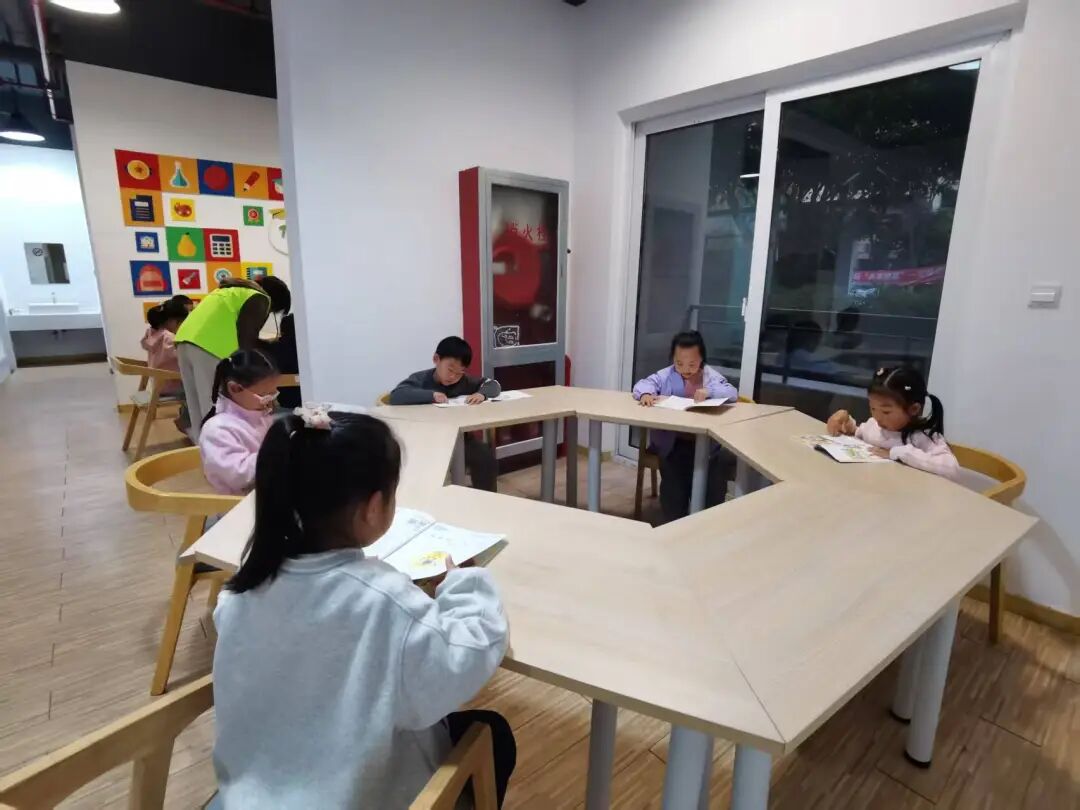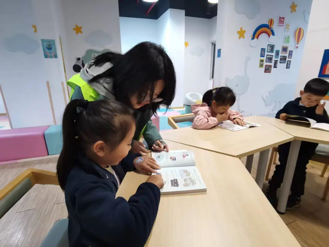 作业完成后,趣味英语课堂开启,“A-B-C……”“Good morning”,清脆的童声在教室中回荡。孩子们目不转睛地盯着黑板,跟着老师认读英文字母,伴着旋律哼唱英文歌曲,沉浸在轻松的学习氛围中。阅读环节里,孩子们纷纷走到书架前挑选心仪的绘本,或独自静心阅读,或邀请老师陪伴共读,还会和小伙伴分享书中的有趣内容。