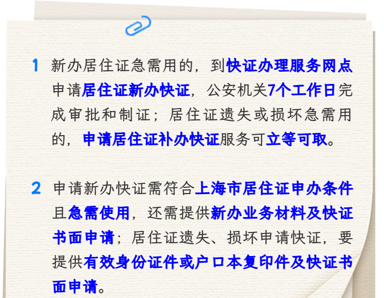 如您是新办上海市居住证,遇求学、考试、就医等情况急需使用居住证,可以到快证办理服务网点申请居住证新办快证服务,公安机关在7个工作日完成审批和制证;如您系居住证持证人,但居住证遗失或损坏,因求学、考试、就医等情况急需使用居住证的,可以到快证办理服务网点申请居住证补办快证服务,立等可取。