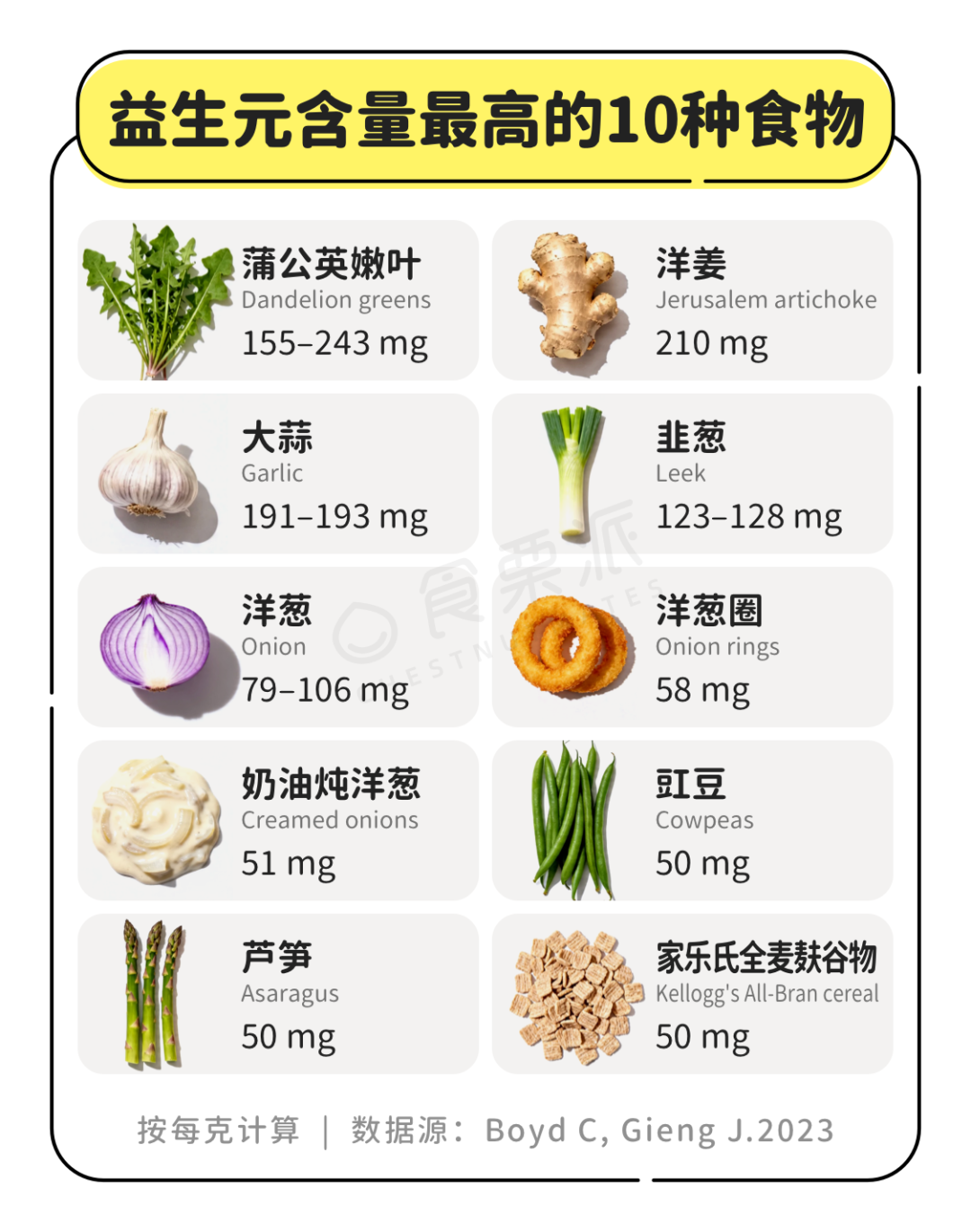 美国研究人员检查了FNDDS(美国农业部膳食研究食品与营养数据库)中收入的8000多种食物,确定了益生元含量最丰富的10种食物,其中有3种跟洋葱有关,分别是洋葱、洋葱圈和奶油洋葱。