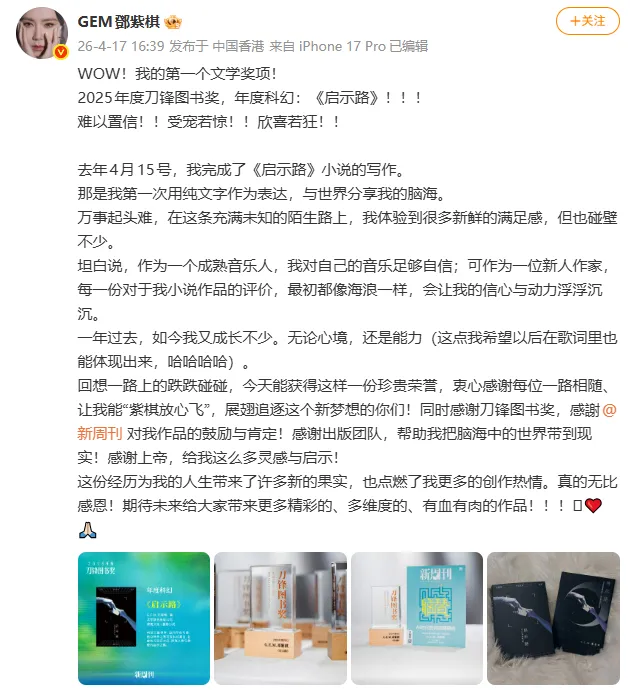 4月17日,2025年刀锋图书奖在泉州揭晓,并在线上全程直播。其中,歌手邓紫棋凭借小说《启示路》获得2025年度刀锋图书奖年度科幻图书奖。