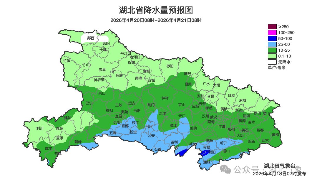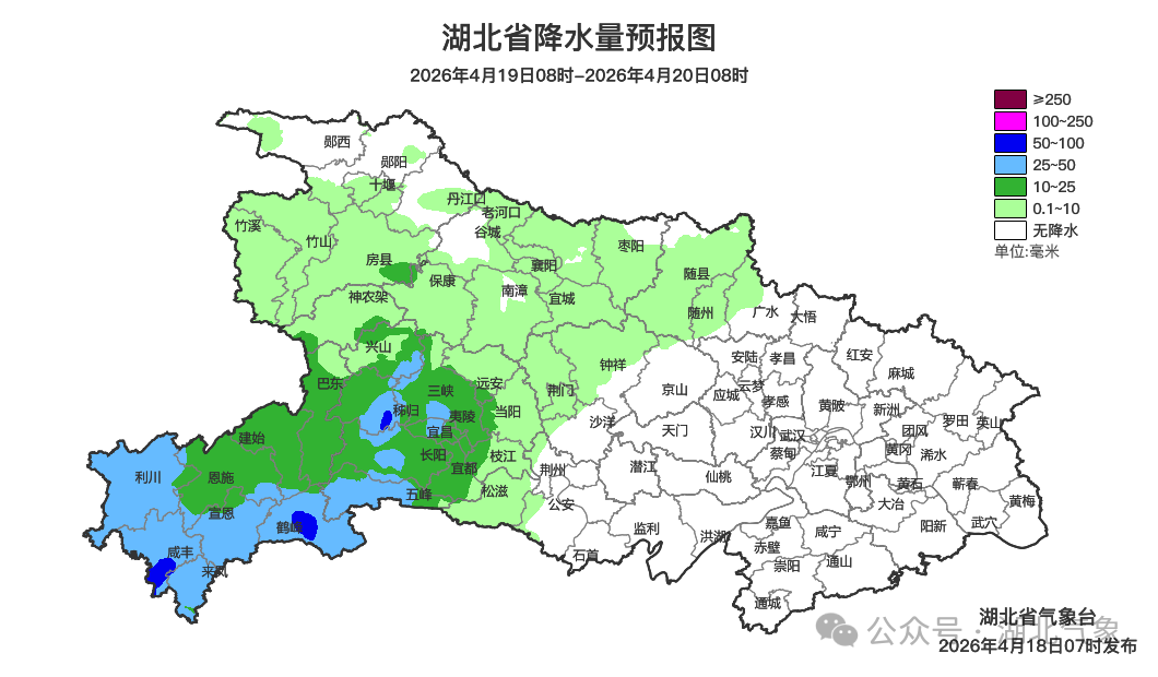 4月19日08时-20日08时,鄂西南多云转中到大雨、局地暴雨;鄂西北、鄂东北西部、江汉平原多云转阵雨或雷阵雨;其他地区晴天到多云。中西部局地有冰雹、雷暴大风等强对流天气。最高气温28~33℃,最低气温15~19℃,偏东风2到3级转偏北风3到5级、阵风6到9级。