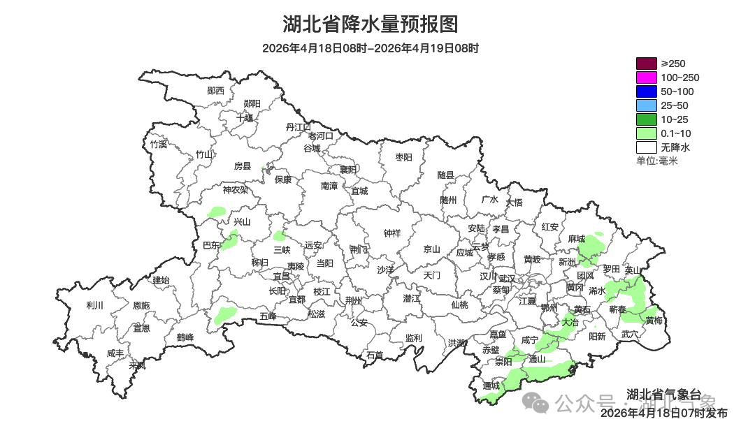 4月18日08时-19日08时,全省晴天间多云,午后鄂西南、鄂东南、鄂东北局地有阵雨或雷阵雨。最高气温28~32℃,最低气温西部11~15℃、中东部15~18℃,偏东风2到3级。