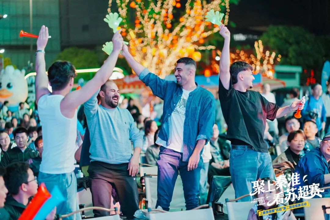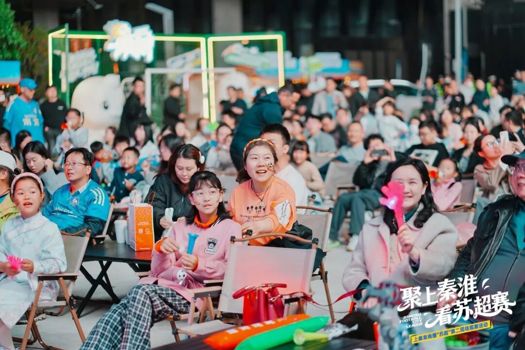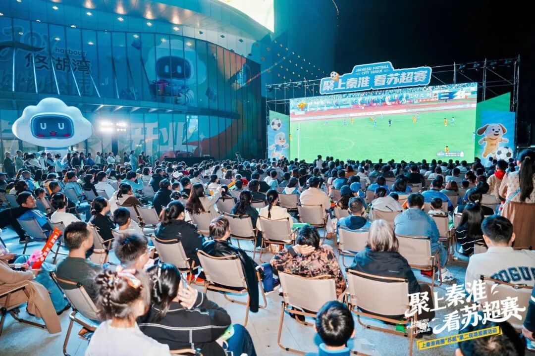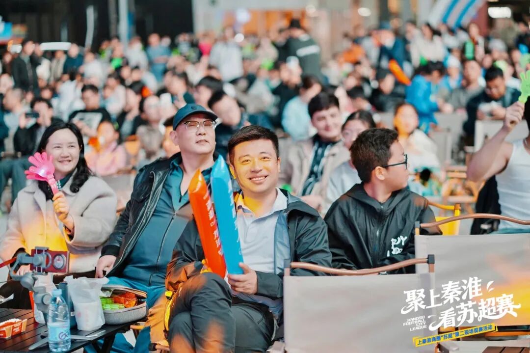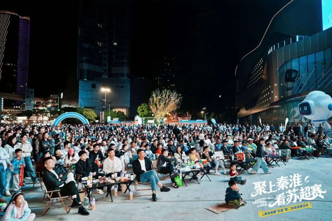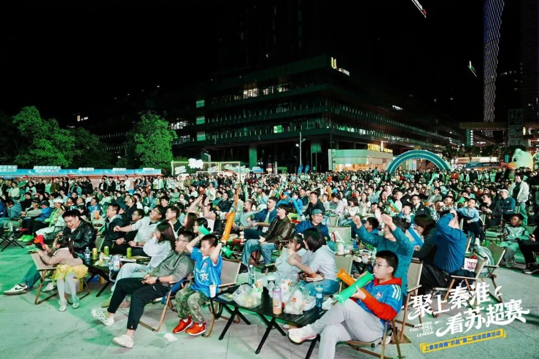 4月18日,由南京文旅集团与江宁开发区紫金山科技城联合打造的“聚上秦淮,看苏超赛”——上秦淮商圈“苏超”第二现场活动中,千余名球迷、消费者及附近居民围坐在悠湖湾购物公园广场搭建的大屏前,共同为南京队精彩比赛助威,呐喊声响彻夜空。