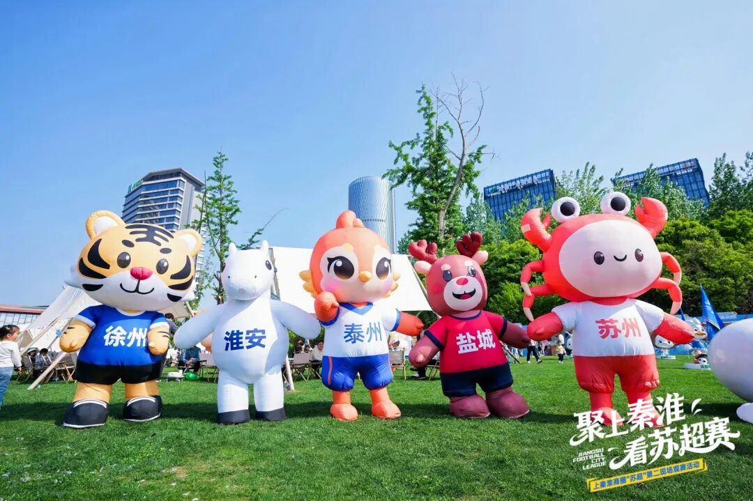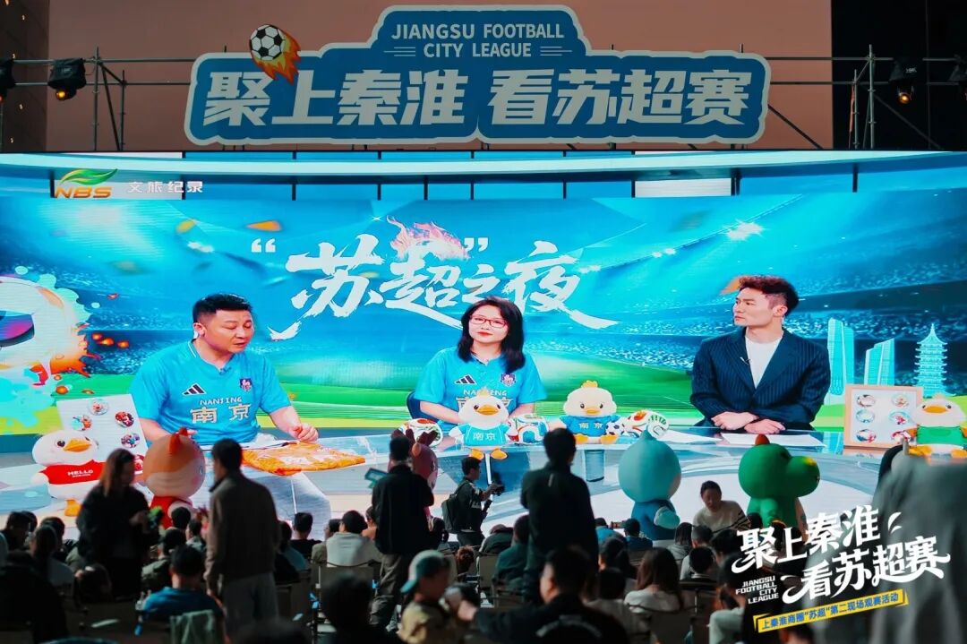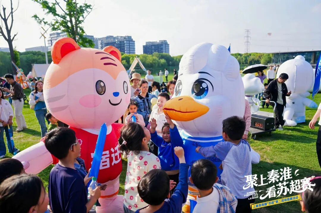 观赛活动现场,苏超赛事主题喷绘、南京队应援标语、球迷旗帜随处可见,南京赛区官方IP“莱斯鸭”、上秦淮商圈吉祥物“悠悠”与市民热情互动。主舞台大屏实时直播赛事,球迷们手持加油棒,呐喊声此起彼伏。