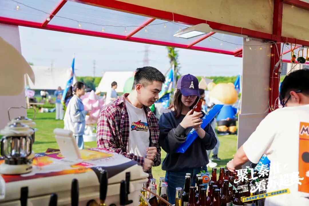 活动现场的苏超主题市集人气火爆,分设美食区与文创区。美食区内,2026“苏超”南京赛区赞助商金陵珍味坊、歪马啤酒、喜姐炸串、回味鸭血粉丝汤等本土知名品牌纷纷推出赛事主题餐品,如“进球嗨啤套餐”“胜利炸串”“南京队专属鸭血粉丝汤”;精酿啤酒沉浸式体验区更是一度排起长队,搭配轻食沙拉、手工披萨、鲜榨果汁等,满足不同人群的口味需求。