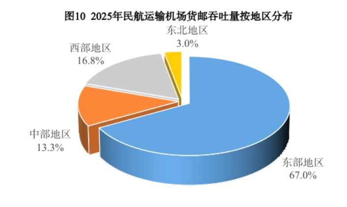 其中,2025年东部地区完成货邮吞吐量1464.20万吨,比上年增长6.4%;中部地区完成货邮吞吐量290.38万吨,比上年增长20.9%;西部地区完成货邮吞吐量367.00万吨,比上年增长12.8%;东北地区完成货邮吞吐量64.84万吨,比上年增长1.2%。