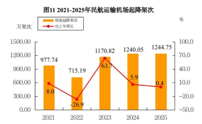 2025年,全国民航运输机场完成起降架次1244.75万架次,比上年增长0.4%。其中,运输架次1086.56万架次,比上年增长2.6%。