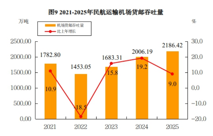 2025年,全国民航运输机场完成货邮吞吐量2186.42万吨,比上年增长9.0%。