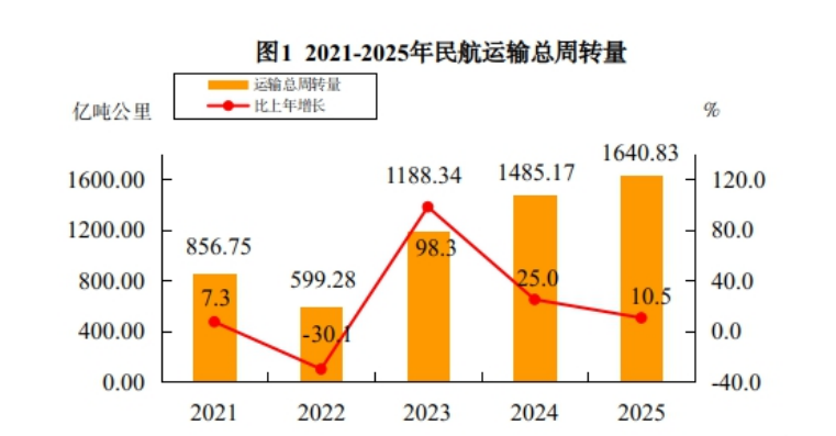 2025年,全行业完成运输总周转量1640.83亿吨公里,比上年增长10.5%。国内航线完成运输总周转量1024.29亿吨公里,比上年增长5.0%,其中,港澳台地区航线完成14.67亿吨公里,比上年增长3.5%;国际航线完成运输总周转量616.54亿吨公里,比上年增长21.0%。