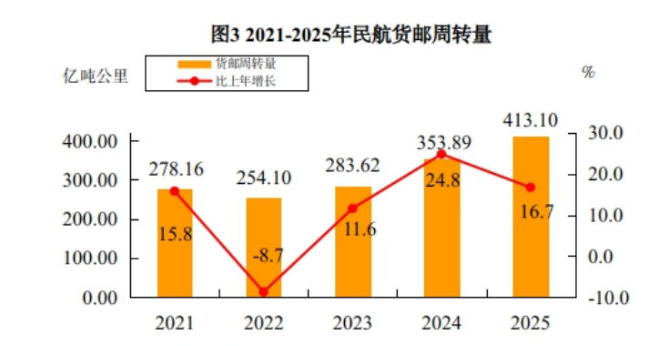 2025年,其他航空公司共完成飞行小时537.15万小时,比上年增长6.6%;完成运输总周转量563.17亿吨公里,比上年增长13.1%;完成旅客运输量28914.08万人次,比上年增长6.0%;完成货邮运输量442.78万吨,比上年增长18.6%。