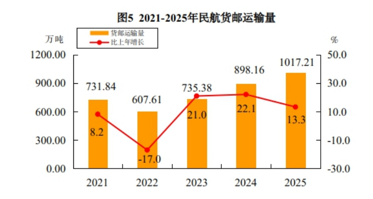 2025年,全行业完成货邮运输量1017.21万吨,比上年增长13.3%。国内航线完成货邮运输量576.96万吨,比上年增长7.3%,其中,港澳台地区航线完成18.07万吨,比上年增长10.2%;国际航线完成货邮运输量440.25万吨,比上年增长22.1%。