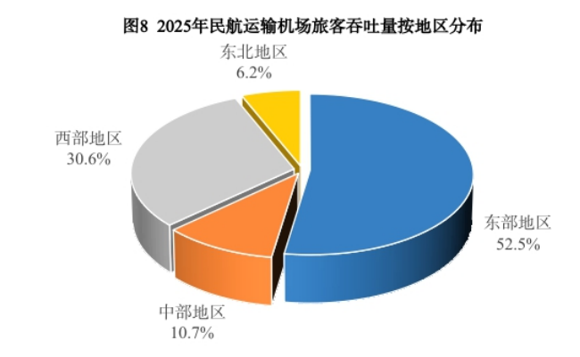 其中,2025年东部地区完成旅客吞吐量8.02亿人次,比上年增长6.0%;中部地区完成旅客吞吐量1.64亿人次,比上年增长1.6%;西部地区完成旅客吞吐量4.69亿人次,比上年增长4.4%;东北地区完成旅客吞吐量0.95亿人次,比上年增长1.7%。