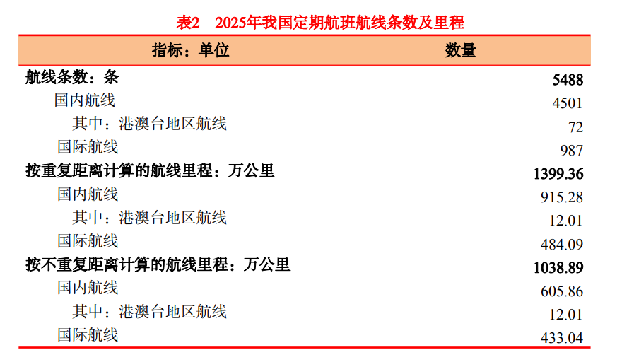2025年,我国共有定期航班航线5488条,国内航线4501条,其中,港澳台地区航线72条,国际航线987条。按重复距离计算的航线里程为1399.36万公里,按不重复距离计算的航线里程为1038.89万公里。