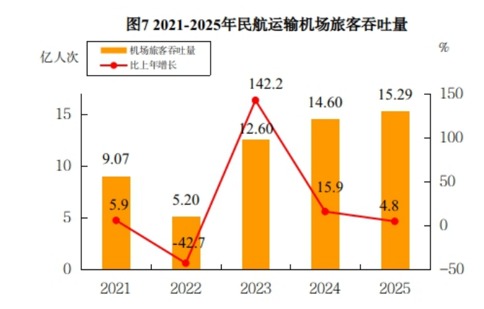 2025年,全国民航运输机场完成旅客吞吐量15.29亿人次,比上年增长4.8%。